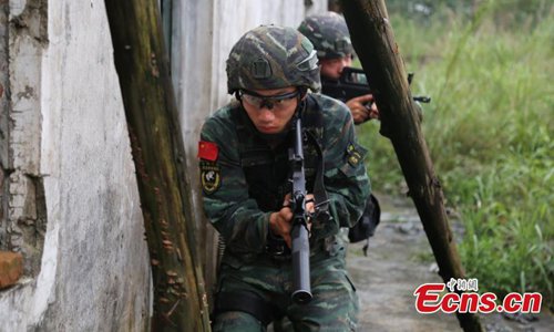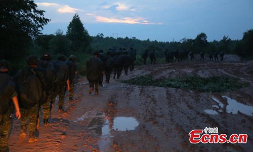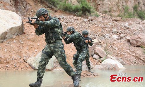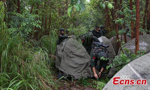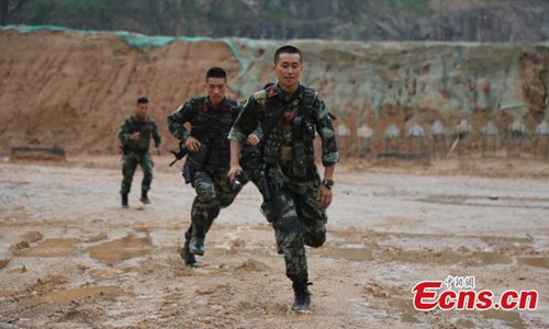 Armed police from the Snow Leopard Commando Unit undergoing intensive training in a hilly area under the blazing sun interrupted by a rainstorm. The training to last a week includes programs challenging the body and mind such as rescue missions and disposal of explosive ordnance. The Snow Leopard Commando Unit created in 2002 is mainly tasked with urban anti-terrorism missions and has safeguarded dozens of major events such as the Beijing Olympic Games, Xinhua reported. (Photo: China News Service)