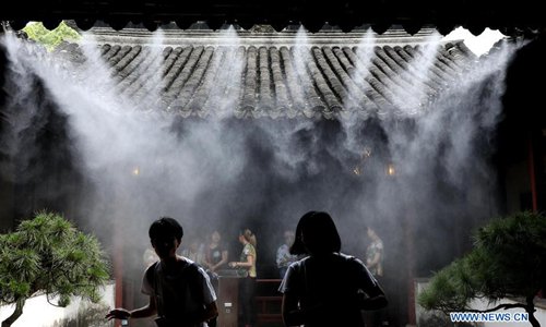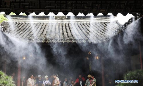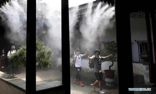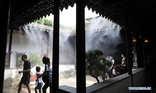 Tourists walk under mist at the Lingering Garden, one of the most famous Chinese classical gardens, in Suzhou, east China's Jiangsu Province, June 9, 2019. The classical garden in Suzhou has opened its intelligent spraying system to cool tourists in hot summer. (Photo: Xinhua)