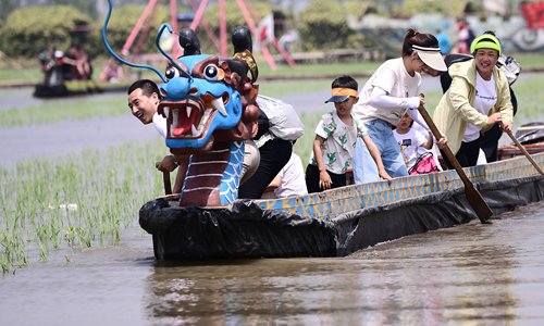 A special dragon boat race, on muddy rice fields rather than a river or lake, is held on Friday in Shenyang, Northeast China's Liaoning Province, to celebrate the Dragon Boat Festival, or Duanwu Festival. Photo: VCG