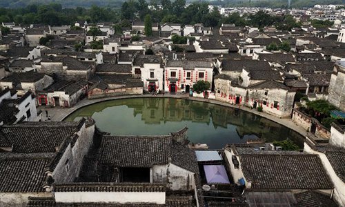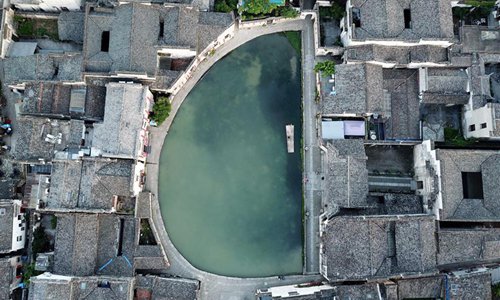 Aerial photo taken on May 22, 2019 shows Yuezhao, or Moon Pool, in Hongcun Village scenic spot in Yixian County, east China's Anhui Province. Anhui Province is located in east China with the Yangtze River, Huaihe River and Xin'an River running through. Huaibei Plain, Jianghuai Hilly Land and Wannan Mountainous Area also contribute to the province's various landscapes. Anhui has made great efforts in ecological development and always been vigorously searching for the harmony between man and nature over years. The province has seen on-going improvement of natural environment in water quality and forest coverage. As an ecological model of Anhui Province, the Wannan area well combines beautiful scenery with brilliant culture. The white walls and black tiles of local buildings have grown into a cultural icon of the region. From June 9 to 11, the Beijing International Horticultural Exhibition will display Anhui's achievements in ecological development with an Anhui Day theme event. (Photo: Xinhua)