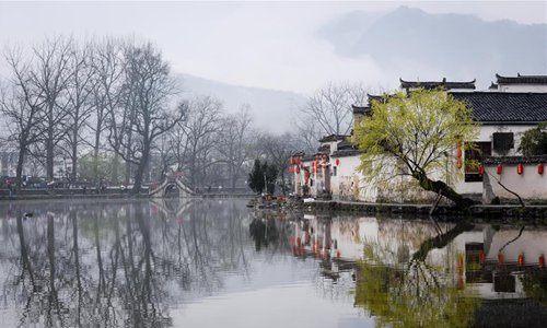 Aerial photo taken on March 16, 2017 shows the scenery of Hongcun Village scenic spot in Yixian County, east China's Anhui Province. Anhui Province is located in east China with the Yangtze River, Huaihe River and Xin'an River running through. Huaibei Plain, Jianghuai Hilly Land and Wannan Mountainous Area also contribute to the province's various landscapes. Anhui has made great efforts in ecological development and always been vigorously searching for the harmony between man and nature over years. The province has seen on-going improvement of natural environment in water quality and forest coverage. As an ecological model of Anhui Province, the Wannan area well combines beautiful scenery with brilliant culture. The white walls and black tiles of local buildings have grown into a cultural icon of the region. From June 9 to 11, the Beijing International Horticultural Exhibition will display Anhui's achievements in ecological development with an Anhui Day theme event. (Photo: Xinhua)