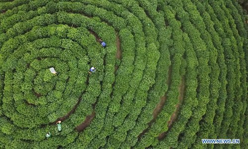 Aerial photo taken on April 16, 2019 shows farmers picking tea leaves in Huangshan, east China's Anhui Province. Anhui Province is located in east China with the Yangtze River, Huaihe River and Xin'an River running through. Huaibei Plain, Jianghuai Hilly Land and Wannan Mountainous Area also contribute to the province's various landscapes. Anhui has made great efforts in ecological development and always been vigorously searching for the harmony between man and nature over years. The province has seen on-going improvement of natural environment in water quality and forest coverage. As an ecological model of Anhui Province, the Wannan area well combines beautiful scenery with brilliant culture. The white walls and black tiles of local buildings have grown into a cultural icon of the region. From June 9 to 11, the Beijing International Horticultural Exhibition will display Anhui's achievements in ecological development with an Anhui Day theme event. (Photo: Xinhua)