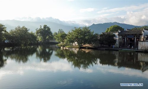 Aerial photo taken on May 22, 2019 shows the scenery of Hongcun Village scenic spot in Yixian County, east China's Anhui Province. Anhui Province is located in east China with the Yangtze River, Huaihe River and Xin'an River running through. Huaibei Plain, Jianghuai Hilly Land and Wannan Mountainous Area also contribute to the province's various landscapes. Anhui has made great efforts in ecological development and always been vigorously searching for the harmony between man and nature over years. The province has seen on-going improvement of natural environment in water quality and forest coverage. As an ecological model of Anhui Province, the Wannan area well combines beautiful scenery with brilliant culture. The white walls and black tiles of local buildings have grown into a cultural icon of the region. From June 9 to 11, the Beijing International Horticultural Exhibition will display Anhui's achievements in ecological development with an Anhui Day theme event. (Photo: Xinhua)