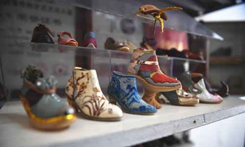 A tiny boot is among more than 100 miniature shoes made over the past seven years by Peng Shizeng, who used to work as a shoe designer at a factory in Jinan, East China's Shandong Province. Photo: VCG