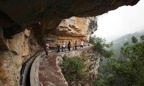 Villagers examine and maintain an aqueduct running from high up a cliff in Bijie, Southwest China's Guizhou Province. Photo: VCG