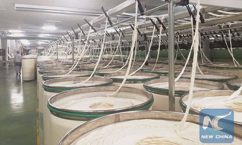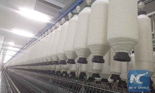 Spindles of yarn are seen at a textile factory of China's Zhongtai (Dangara) New Silk Road Textile Industry Company in Dangara, Tajikistan on May 24, 2019. (Photo: Xinhua)