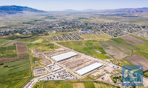 This aerial photo taken on May 24, 2019 shows the textile factories of China's Zhongtai (Dangara) New Silk Road Textile Industry Company in Dangara, Tajikistan. (Photo: Xinhua)