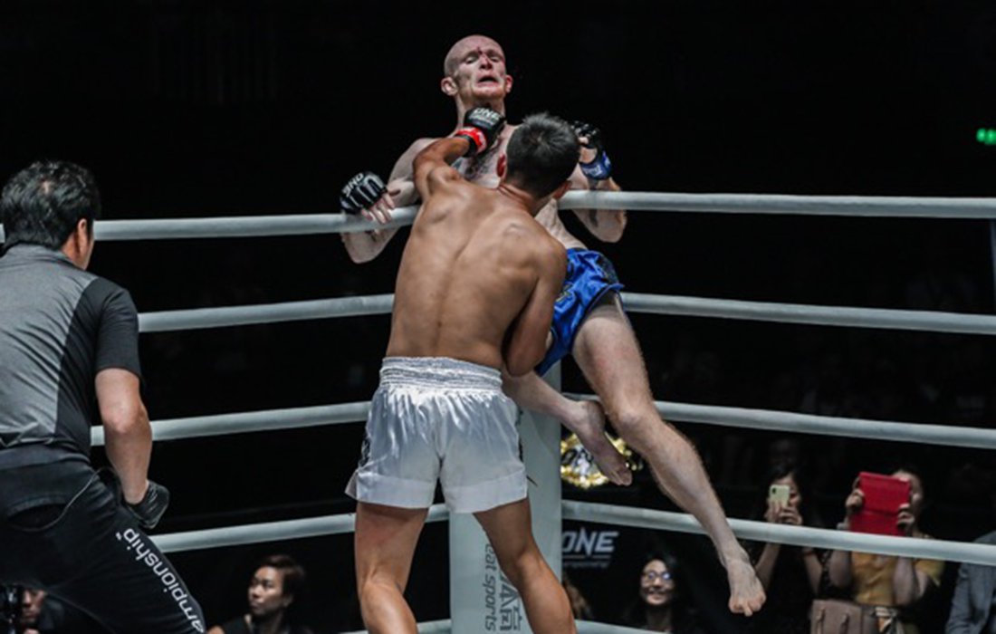 China’s Chen Lei kicks Indonesia’s Anthony Engelen in the face on Saturday night in Shanghai. Photo: Courtesy of ONE Championship