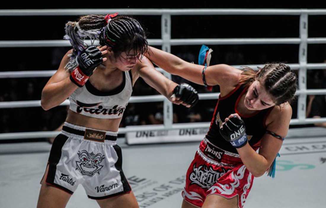 Thailand’s Stamp Fairtex (left) fights Australian Alma Juniku on Saturday night in Shanghai. Photo: Courtesy of ONE Championship