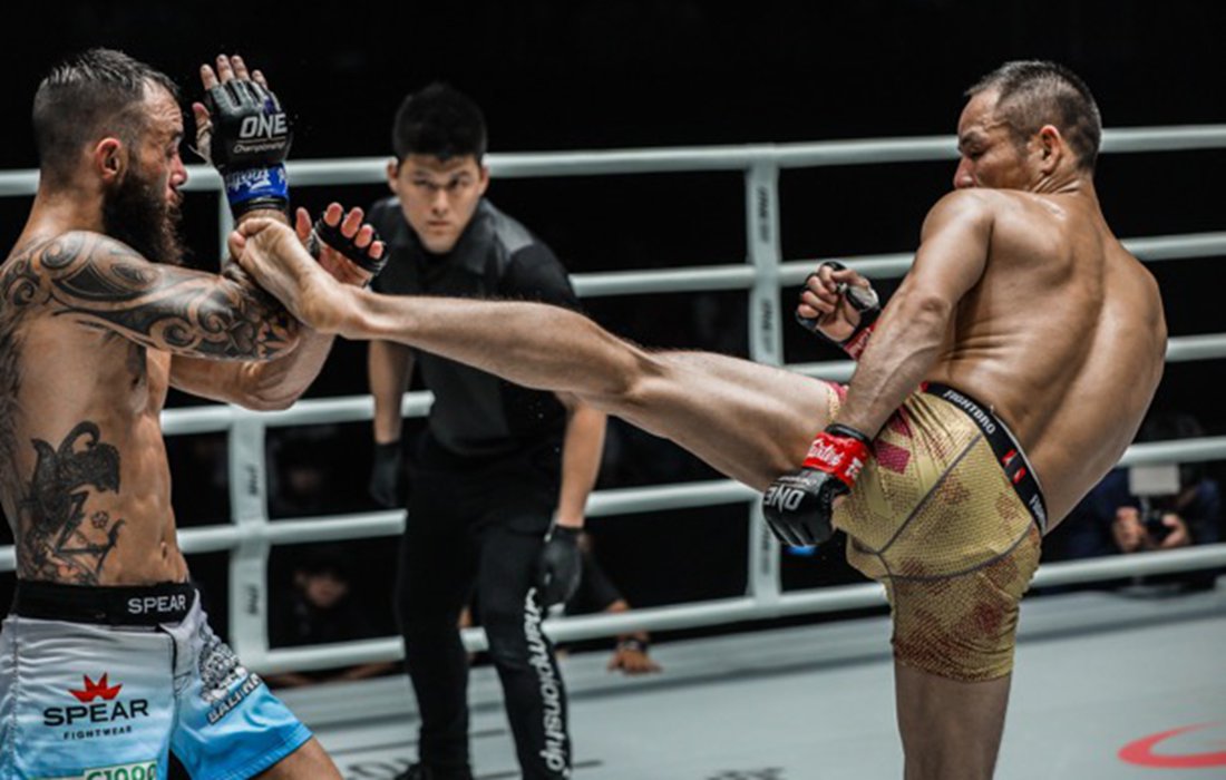 China’s Chen Lei kicks Indonesia’s Anthony Engelen on Saturday night in Shanghai. Photo: Courtesy of ONE Championship