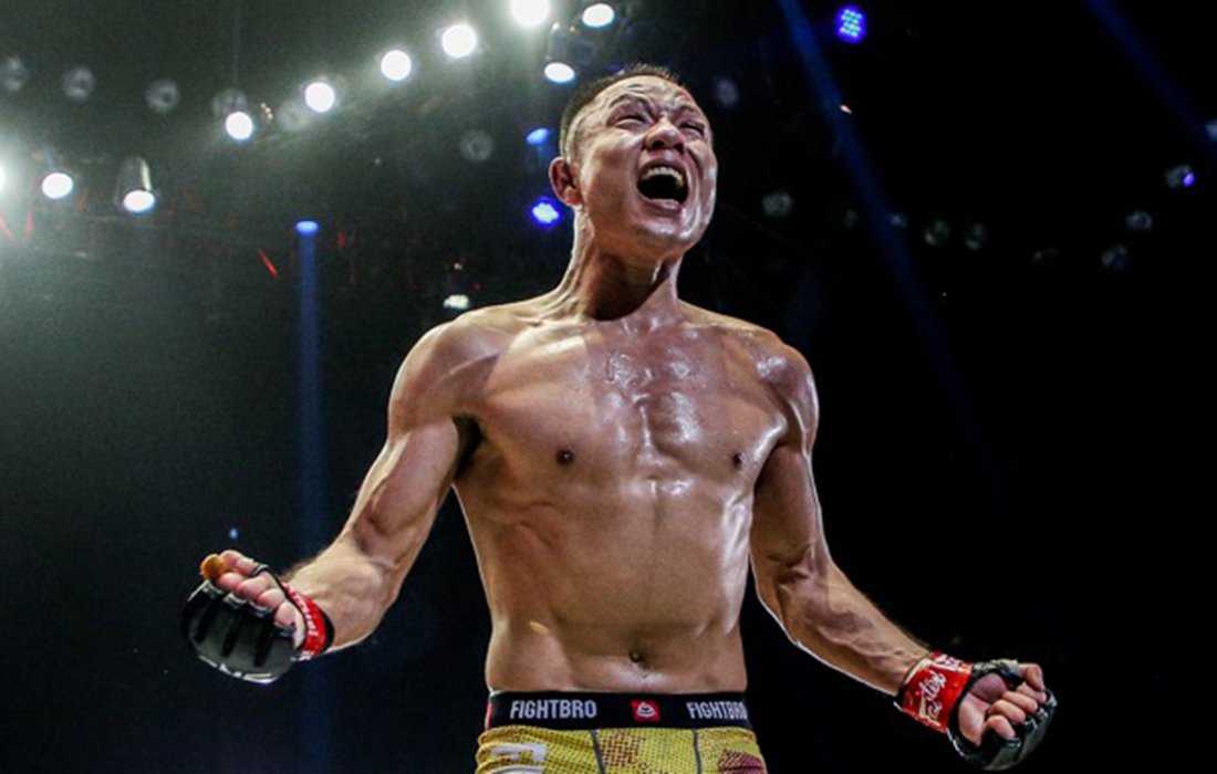 China’s Chen Lei celebrates beating Indonesia’s Anthony Engelen on Saturday night in Shanghai. Photo: Courtesy of ONE Championship