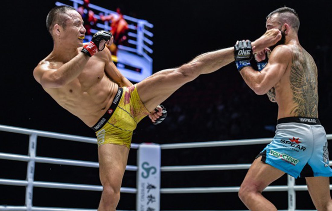 China’s Zhang Chenglong (left) kicks Australia’s Tyler Hardcastle on Saturday night in Shanghai. Photo: Courtesy of ONE Championship