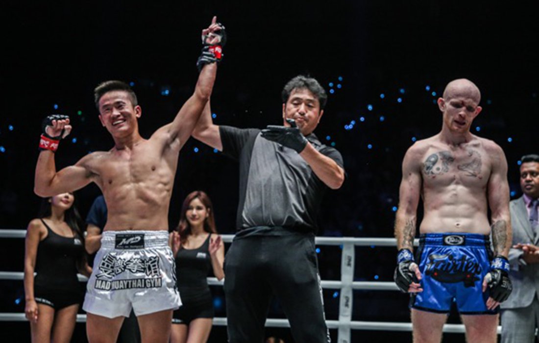 China’s Han Zihao is declared the winner over Scotland’s Andrew Miller on Saturday night in Shanghai. Photo: Courtesy of ONE Championship