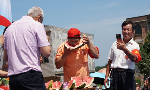 Local residents in Lanshan county, Central China's Hunan Province compete Saturday to see who can eat 2.5-kilogram watermelons the fastest at an annual watermelon festival. Photo: VCG