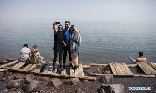 People take pictures on the beach of Urmia Lake in northwestern Iran on June 17, 2019. The expansion of water level of Iran's northwest Urmia Lake over the past months has attracted tourists both from and out of Iran. The lake, which has been on the verge of extinction over the past decades, began to expand following the two-month-long springtime showers that began pouring across the country in March. (Photo: Xinhua)