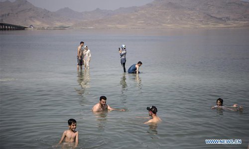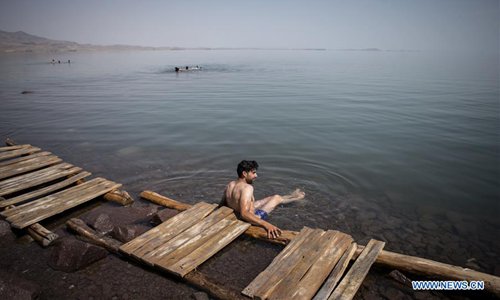 People enjoy themselves in the Urmia Lake in northwestern Iran on June 17, 2019. The expansion of water level of Iran's northwest Urmia Lake over the past months has attracted tourists both from and out of Iran. The lake, which has been on the verge of extinction over the past decades, began to expand following the two-month-long springtime showers that began pouring across the country in March. (Photo: Xinhua)