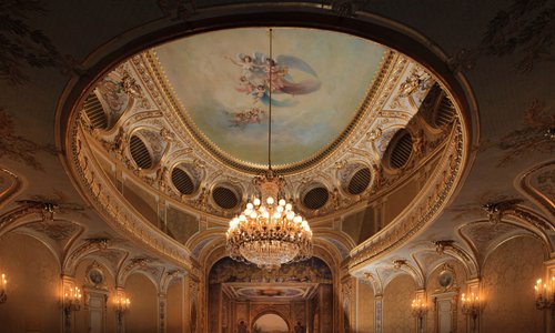 Ceiling and original chandelier and lights from the 19th century at the Napoleon III theater Photo: AFP