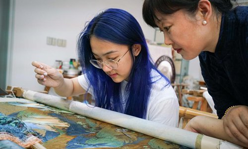 Yao Huifen (R) watches her daughter making embroidery at her workshop in Zhenhu Town of Suzhou, east China's Jiangsu Province, June 11, 2019. Suzhou Embroidery, one of the four most famous embroideries in China, is originated in Suzhou and has a history of more than 2,000 years. Known for its elegant pattern, artistic design, fine handwork and varied stitches, it was listed as a national intangible cultural heritage of China in 2006. Yao Huifen, representative inheritor of the craft, was born in Suzhou in 1967 in a family of embroidery. Influenced by her grandparents and parents since young, she fell in love with the handicraft and could make great work when she was a teenager. After becoming the apprentice of masters Mu Zhihong and Ren Huixian, Yao's skill made great progress. She opened her own workshop of Suzhou Embroidery with her sister Yao Huiqin in 1998, starting her career as a craftswoman. Over the years since 1991, Yao's artworks have earned numerous prizes, including the "Shanhua Prize", the highest prize for China's folk art. In the recent ten years, Yao Huifen created a new method of embroidery called "Simple Stitch", and incorporated Chinese traditional paintings and portraits into her works, many of which were collected by museums and art galleries including the British Museum.Yao has also gone to many countries to introduce Suzhou Embroidery as its promotion ambassador, including the United States, France, Italy, Britain, Russia, Sweden and Finland. Despite her achievements, Yao sticks to her embroidery career as a craftswoman and has created lots of artworks with distinctive styles. In 2017, 34 Suzhou Embroidery works of Yao Huifen were chosen to be displayed at the Venice Biennale China Pavilion and won extensive attention. One artwork "Skeleton Fantasy" uses about 50 kinds of stitches of Suzhou Embroidery, making a breakthrough on the traditional embroidery methods. Zhenhu Town of Suzhou City has more than 8,000 craftsmen of Suzhou Embroidery and hundreds of shops and has developed an industry of Suzhou Embroidery in recent years with the help of local government. In order to inherit the craft, Yao has accepted numerous apprentices both from home and abroad since the 1990s, worrying that there are less young people willing to learn the art nowadays. "I want to plant a seed of Suzhou Embroidery in their mind, even if they only want to learn it as a hobby, " Yao said, "and I hope more youngsters will join us and pass on the traditional craft through generations." (Xinhua/Yang Lei)