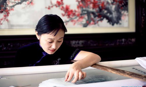 Photo taken in 2010 shows Yao Huifen making Suzhou Embroidery. Suzhou Embroidery, one of the four most famous embroideries in China, is originated in Suzhou and has a history of more than 2,000 years. Known for its elegant pattern, artistic design, fine handwork and varied stitches, it was listed as a national intangible cultural heritage of China in 2006. Yao Huifen, representative inheritor of the craft, was born in Suzhou in 1967 in a family of embroidery. Influenced by her grandparents and parents since young, she fell in love with the handicraft and could make great work when she was a teenager. After becoming the apprentice of masters Mu Zhihong and Ren Huixian, Yao's skill made great progress. She opened her own workshop of Suzhou Embroidery with her sister Yao Huiqin in 1998, starting her career as a craftswoman. Over the years since 1991, Yao's artworks have earned numerous prizes, including the "Shanhua Prize", the highest prize for China's folk art. In the recent ten years, Yao Huifen created a new method of embroidery called "Simple Stitch", and incorporated Chinese traditional paintings and portraits into her works, many of which were collected by museums and art galleries including the British Museum.Yao has also gone to many countries to introduce Suzhou Embroidery as its promotion ambassador, including the United States, France, Italy, Britain, Russia, Sweden and Finland. Despite her achievements, Yao sticks to her embroidery career as a craftswoman and has created lots of artworks with distinctive styles. In 2017, 34 Suzhou Embroidery works of Yao Huifen were chosen to be displayed at the Venice Biennale China Pavilion and won extensive attention. One artwork "Skeleton Fantasy" uses about 50 kinds of stitches of Suzhou Embroidery, making a breakthrough on the traditional embroidery methods. Zhenhu Town of Suzhou City has more than 8,000 craftsmen of Suzhou Embroidery and hundreds of shops and has developed an industry of Suzhou Embroidery in recent years with the help of local government. In order to inherit the craft, Yao has accepted numerous apprentices both from home and abroad since the 1990s, worrying that there are less young people willing to learn the art nowadays. "I want to plant a seed of Suzhou Embroidery in their mind, even if they only want to learn it as a hobby, " Yao said, "and I hope more youngsters will join us and pass on the traditional craft through generations." (Xinhua)