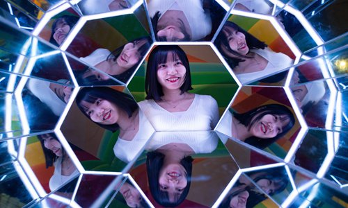 A woman is amused by multiple images of herself in an exhibit at the newly-opened Van Gogh star gallery in Nanjing, East China's Jiangsu Province. Photo: VCG