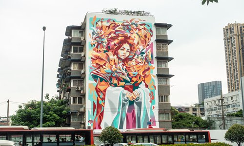 An eight-story-high mural named "Sun," is painted by a Belarussian couple, on the wall of an old residential building in Chengdu, Southwest China's Sichuan Province. Photo: VCG