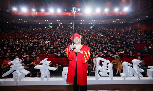 Liu Jinhua, president of Hangzhou Normal University Qianjiang College in East China's Zhejiang Province, takes a selfie with graduates at a graduation ceremony on Friday. Photo: VCG