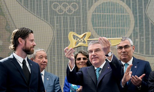 IOC President Thomas Bach raises the new key, next to senior architect Jan Ammundsen (left), during the inauguration ceremony of the Olympic House, the new IOC headquarters, in Lausanne, on Sunday. Photo: AFP