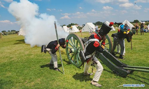 Re-enactors take part in a cannon demonstration at the site of Battle of Waterloo in Waterloo, Belgium, on June 23, 2019. A number of commemorative events were held here on June 22 and June 23 to mark the Battle of Waterloo which happened on June 18, 1815. (Xinhua/Zhang Cheng)