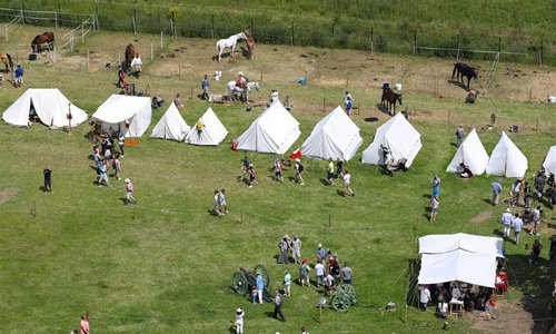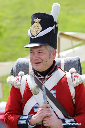 A re-enactor introduces details of the Battle of Waterloo to visitors at the site of Battle of Waterloo in Waterloo, Belgium, on June 23, 2019. A number of commemorative events were held here on June 22 and June 23 to mark the Battle of Waterloo which happened on June 18, 1815. (Xinhua/Zhang Cheng)