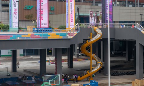 People tired of the stairs can get to the ground floor using a spiral slide outside a light rail station in Southwest China's Chongqing Municipality. Photo: VCG