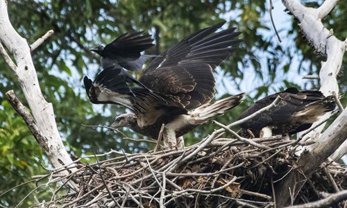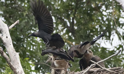 A crow attacks a family of white-bellied sea eagle fledglings in an attempt to snatch their food in Singapore on June 24, 2019. (Xinhua/Then Chih Wey)