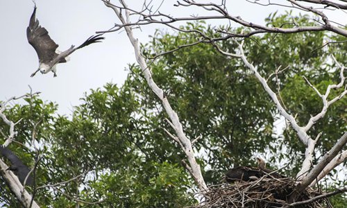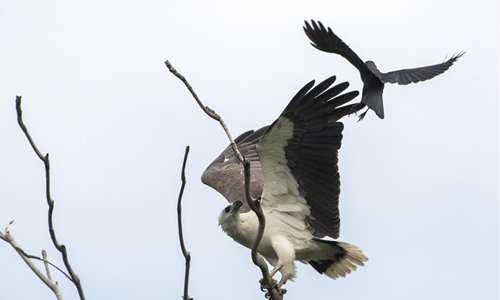 A white-bellied sea eagle chases a crow from its nest in Singapore on June 24, 2019. (Xinhua/Then Chih Wey)