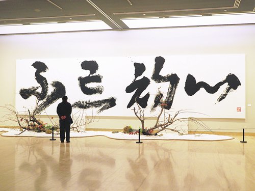 A man looks at a piece of Chinese calligraphy artwork reading "Remaining true to the original aspiration" at an exhibition in Beijing's National Art Museum of China on October 19, 2017. Photo: VCG