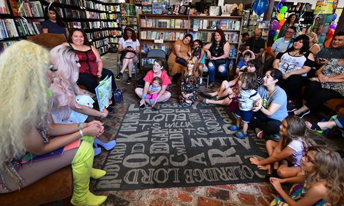 Drag queens Scalene (left) and Athena read to adults and children during Drag Queen Story Hour at Cellar Door Books in Riverside, California, on June 22. Photo: AFP