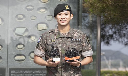South Korean actor Kim Soo-hyun poses for a picture when compete his military service on Monday. Photo: IC