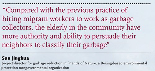Compared with the previous practice of hiring migrant workers to work as garbage collectors, the elderly in the community have more authority and ability to persuade their neighbors to classify their garbage, said Sun Jinghua, project director for garbage reduction in Friends of Nature, a Beijing-based environmental protection nongovernmental organization.