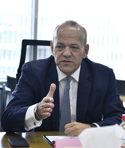Gibraltar's Minister of Commerce Albert Isola talks to media persons in Beijing in June. Photo: Courtesy of Huobi