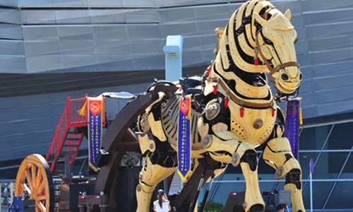 A giant model of a horse, which is nine meters tall, is on display on a square of Dalian, Northeast China's Liaoning Province on Monday, and is attracting a lot of attention from passersby. Dalian is a coastal city where the 2019 Summer Davos meeting is being held. Photo: VCG