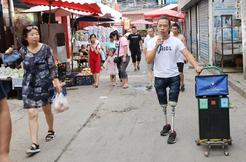 A young man surnamed Yu, a legless street singer, sings on the street of Xi'an, Northwest China's Shaanxi Province on Tuesday. Yu has sustained himself by singing for six years. Photo: VCG