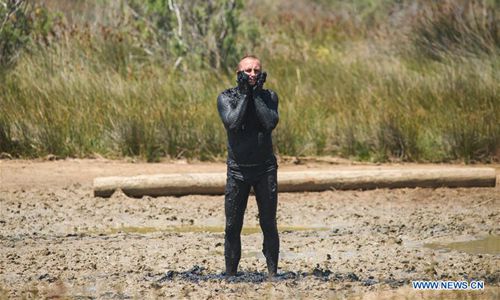 A man takes a mud bath at Queen's Beach in Nin, Croatia, July 3, 2019. Mud bath in Nin has a history of centuries as it is believed to have healing effect for some illnesses. (Photo:Xinhua)