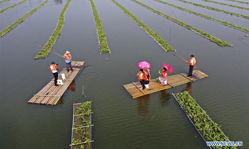 Tourists pick herbs on the water at Meigui Aquatic Botanical Garden in Tuanzhuang Village of Baoying County of Yangzhou, east China's Jiangsu Province, July 6, 2019. Tuanzhuang Village has been taking advantage of its good water and aquatic environment to develop local tourism and rural revitalization. (Photo: Xinhua)