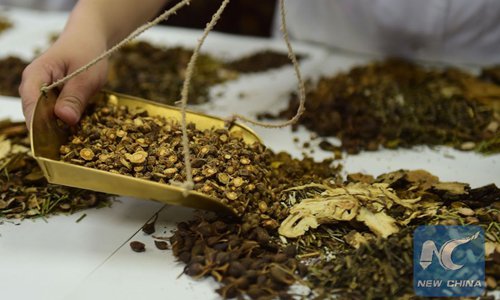 A staff member of Cangzhou People's Hospital in Hebei Province, north China, fills prescriptions of Traditional Chinese Medicine for patients, May 26, 2019.(Photo: Xinhua)