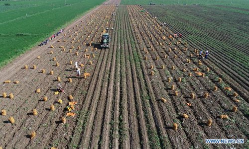In this aerial photo taken on July 6, 2019, farmers harvest potatoes in Xilianggezhuang Village of Hugezhuang Township, Luannan County, north China's Hebei Province. A "plant-to-order" business mode is being followed by local potato farmers, who sell their product according to the needs of customers in markets such as Beijing and Tianjin. (Photo: Xinhua)