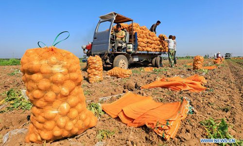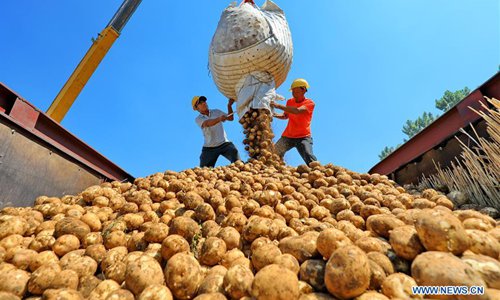 Farmers load and transport potatoes in Xilianggezhuang Village of Hugezhuang Township, Luannan County, north China's Hebei Province, July 6, 2019. A "plant-to-order" business mode is being followed by local potato farmers, who sell their product according to the needs of customers in markets such as Beijing and Tianjin. (Photo: Xinhua)