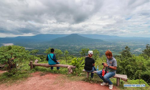 Tourists rest at a viewpoint of Phu Pa Po mountain in Loei Province, Thailand, July 7, 2019. Loei Province, 520 kilometers from Bangkok, is located on the bank of the Mekong River along the Phetchabun mountain range. (Photo: Xinhua)