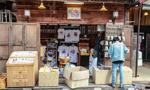 A tourist picks souvenir at a shop at Chiang Khan town in Loei Province, Thailand, July 7, 2019. Loei Province, 520 kilometers from Bangkok, is located on the bank of the Mekong River along the Phetchabun mountain range. (Photo: Xinhua)