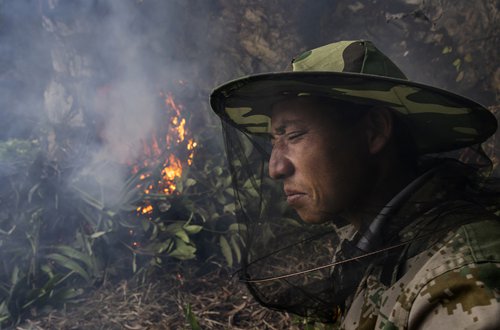 Lisu honey hunter Ma Yongde sits next to a fire he made to scatter bees before gathering wild cliff honey. Photo: VCG
