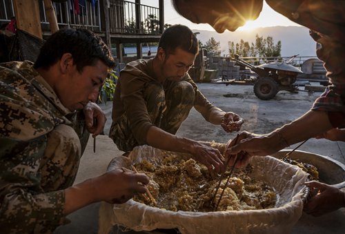 Lisu people clean fresh wild cliff honey at the family home after gathering it from hives in a gorge. Photo: VCG