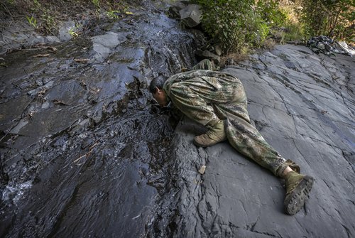Ma takes a drink from a stream after gathering wild cliff honey. Photo: VCG