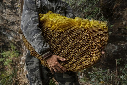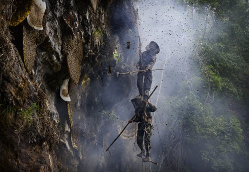 Hunters suit up in protective gear and use smoke to scatter the giant Himalayan honey bees from their hives to reduce the risk, but there are literally thousands of them in each hive.